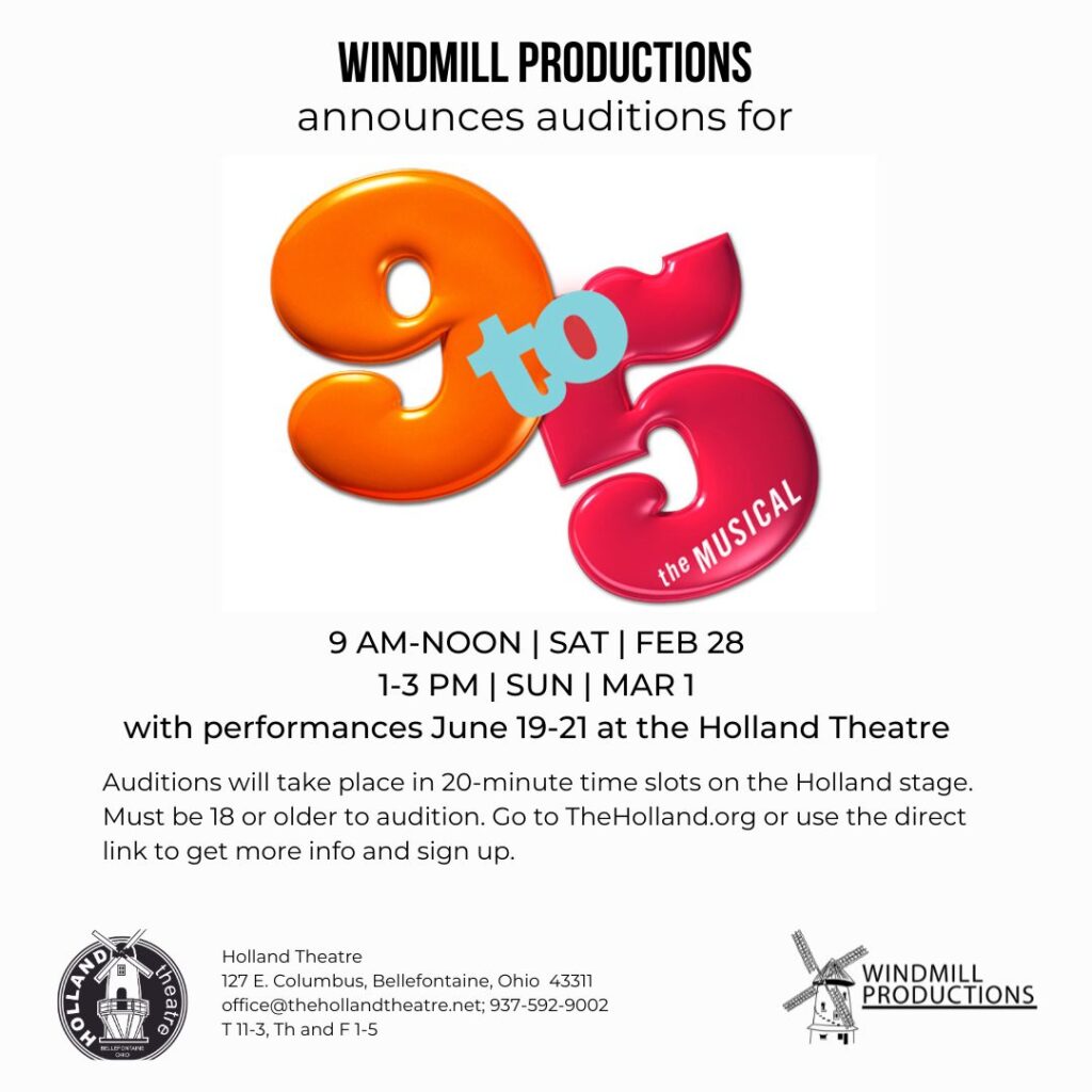 Windmill Productions announce auditions on Feb. 28 and March 1, 2026, for the musical 9 to 5, with performances set for June 19-21. Get more info and sign up here!